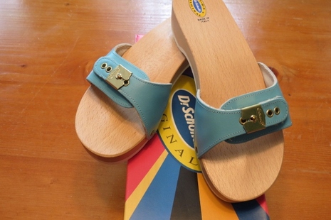 Wait a minute, I say ... Dr. Scholl is about fixing feet ... foot health and function.  Not about shoes.  With an exception.  Most ladies of the Baby Boomer era are well-acquainted with the Dr. Scholl wooden exercise platform sandal (and yes, that is its full, proper description) seen above and  launched upon the world in the late 1960s.  By the mid 70s, every female I knew was wearing them ... myself included.  It was the "viral" product of the day.  It was also one of the few times I ever gave into peer pressure and followed the crowd.  And wondered ... and still wonder ... why. Getting used to wearing those sandals took some doing.  Arch cramps.  Tryng to keep the things on by scrunching up your toes.  The irritation of the band across the instep.  And trying to run in them?  Forget it - just kick them off and keep on trucking.  If you did choose to stick with it - which I did for a couple of years - you did begin to feel the "love".  Can't say it was ever a wild infatuation on my part.  But they certainly became an ingrained part of my every day existence.  And - at the end of the day - the feet were probably better off for it.  Those sandals are still selling to this day.